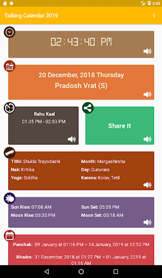 Tap on Talking Calendar 2021, and the app would speak today’s time, date, day, rahu kal, abhijit muhurat, tithi, nakshatra, yoga, karana, panchak, bhadra, hora, choghadiya for 2021. This Bolti Ghadi & Bolta Calendar 2021 helps you get all benefits of 2021 Panchang just by listening.