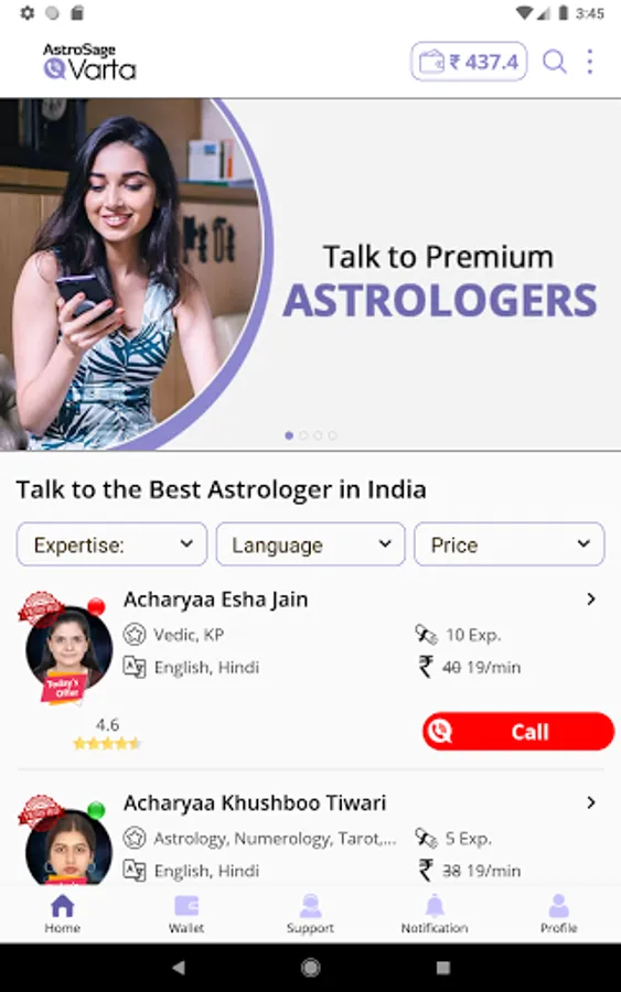 Connect with a wide range of Premium Astrologers with AstroSage Varta in no time and get access to accurate online astrology services and unlimited astrology consultations. You will be able to consult not only Vedic astrologers but also Tarot Card Readers and Numerologists. You can also consult Palmists and Vastu experts for best horoscope services.
