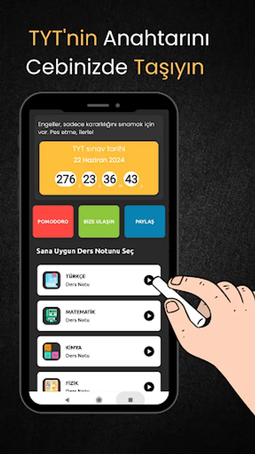 The tyt notes mobile application that we have developed for the university dream that everyone has been building for years is ready for you to use. Our application has a very practical user interface and allows you to get used to it in a short time. Since the TYT part has an important effect in the YKS exam, it is very important to use the time correctly, so the pomodoro technique has been added to the application. In order to use it effectively. Sometimes emotional collapses may occur during the exam preparation process. There is a motivation section here that can wake you up and adapt to the exam quickly, so we prepare ourselves for the exam again with a fast adaptation.