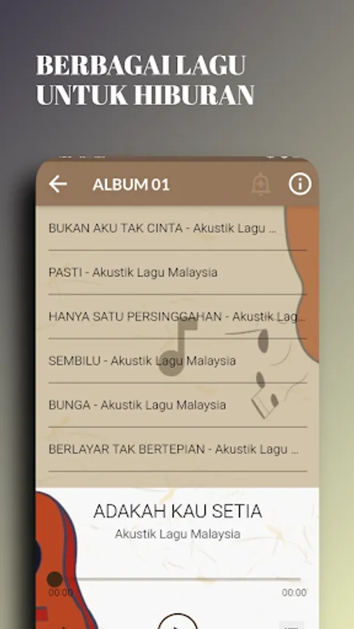 1. Acoustic MP3 Malaysian Songs: This application offers a collection of Malaysian songs with acoustic arrangements that present a more intimate and deep feel. Listen to acoustic versions of popular Malaysian songs that will immerse you in the beautiful music.