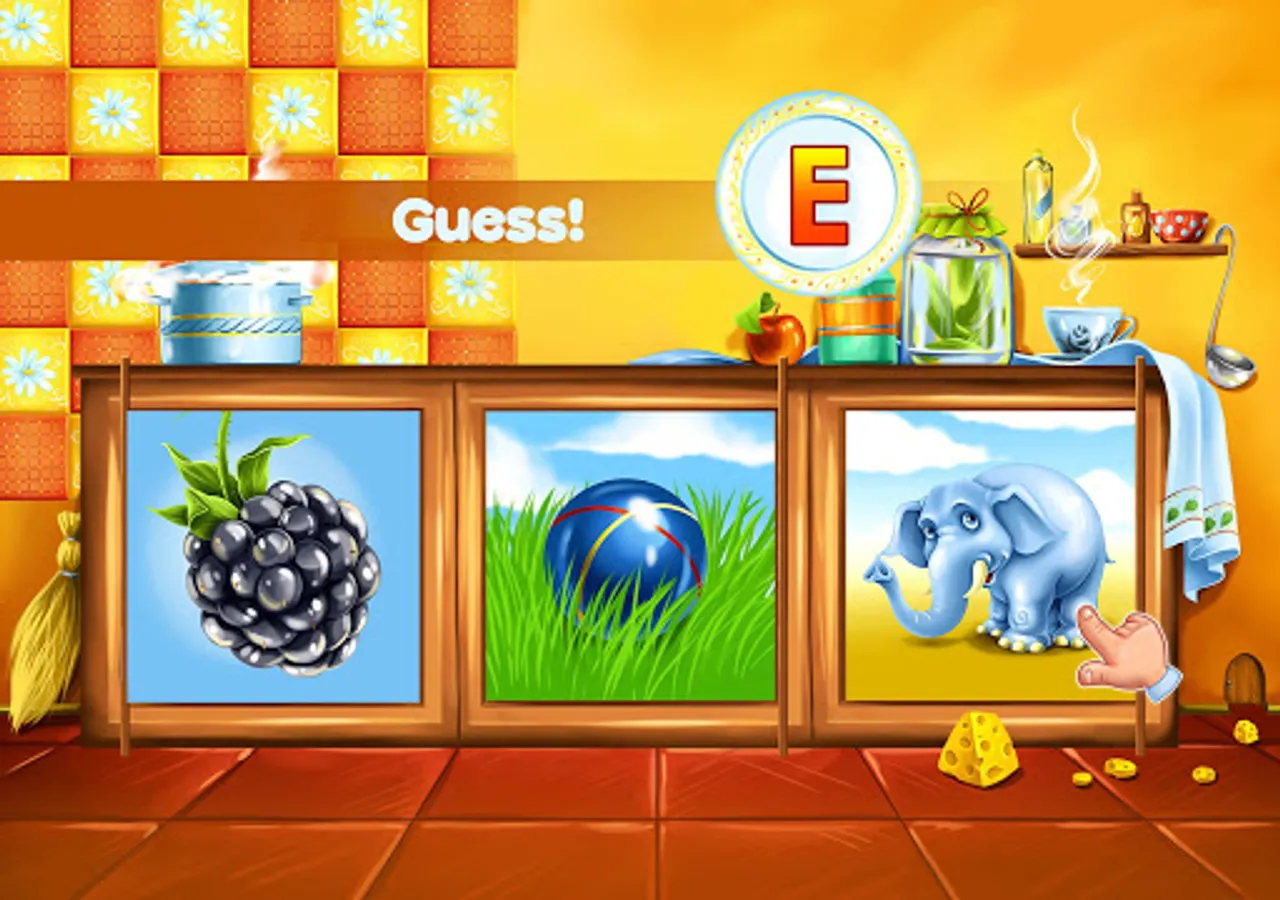 🏠The next location is a cozy kitchen with wooden cabinets inside which the objects and animals appear. The task is very similar to the first one where the kid should connect the letter and the object.