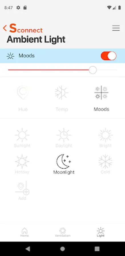 • Moods : There are 6 modes available in the Moods function. With the Add button you can create your own lighting mode.