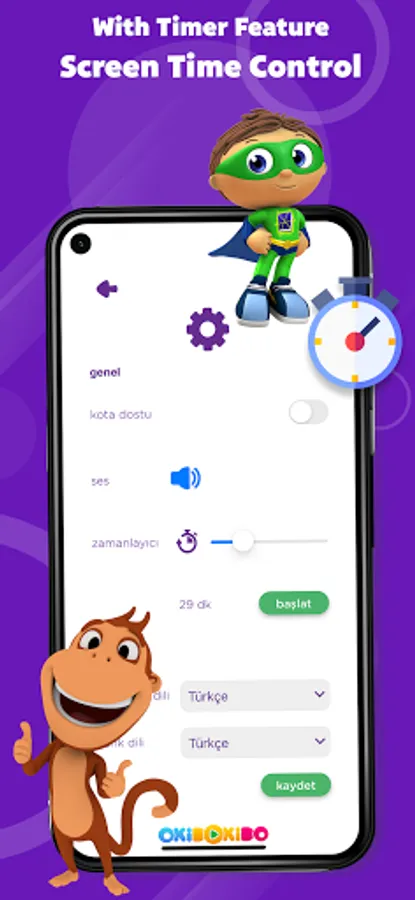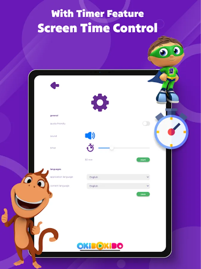 With Okidokido, you can choose the time you prefer between 0-120 minutes for each session by using the time planner, according to your children's ages or their needs. When the time is over, the application closes.