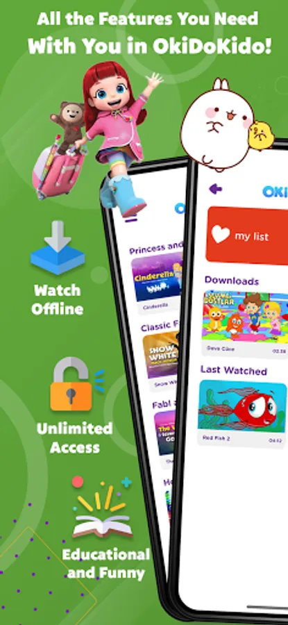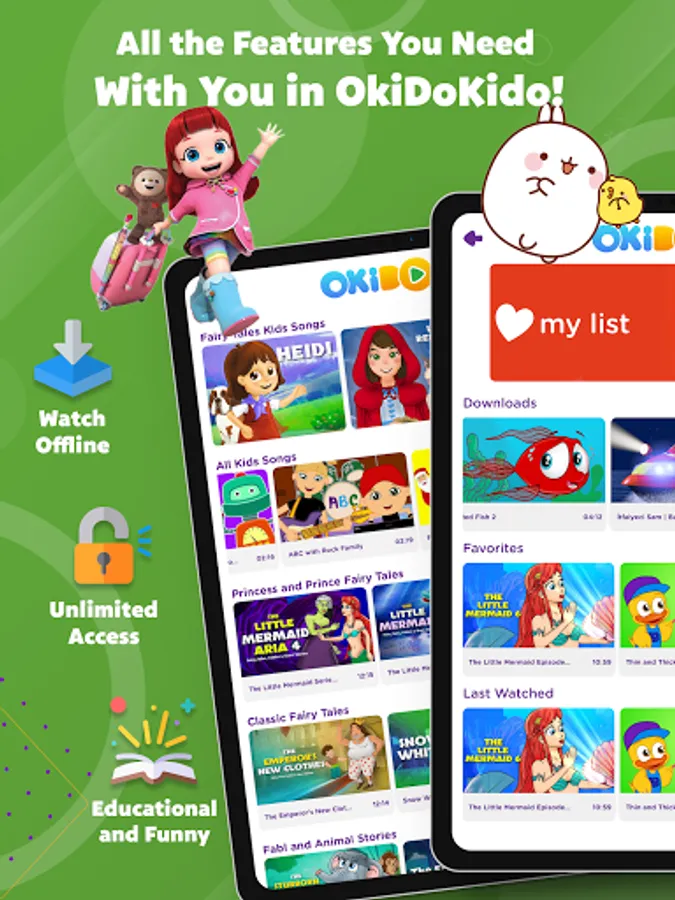 You can enjoy Okidokido without spending your internet quota, when you’re on vacation, on a plane, in any place with no internet connection or low connection speed. All you have to do is to download the videos your child likes and store them in “my lists”.
