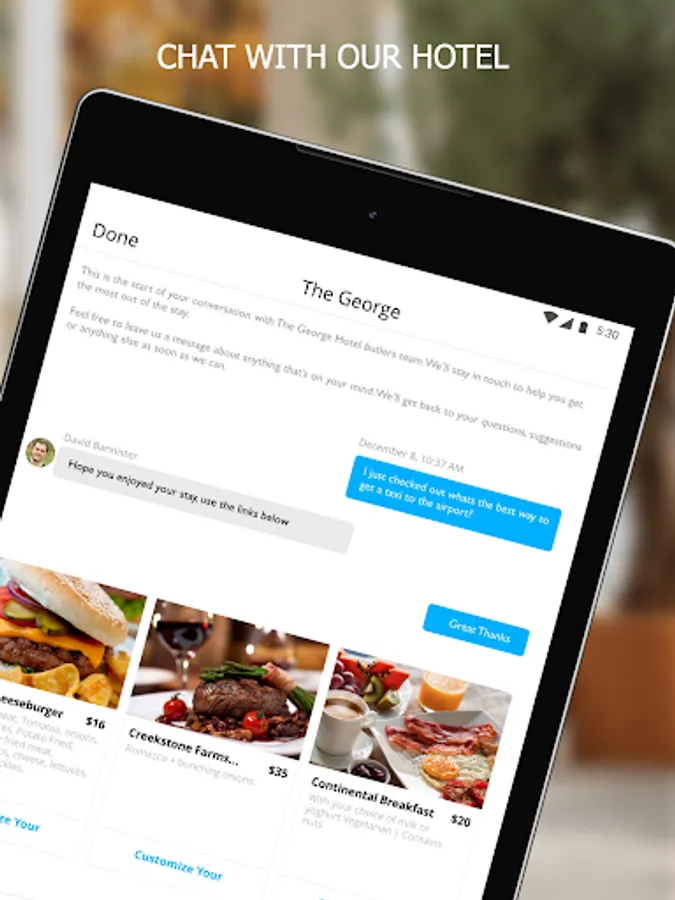 Our app is designed to make The George’s guests and members as comfortable and convenient as possible. You can book hotel rooms, club events, meeting rooms and order room service. In addition you can also book a table in our restaurants, gym class or spa treatment all at the touch of a button.