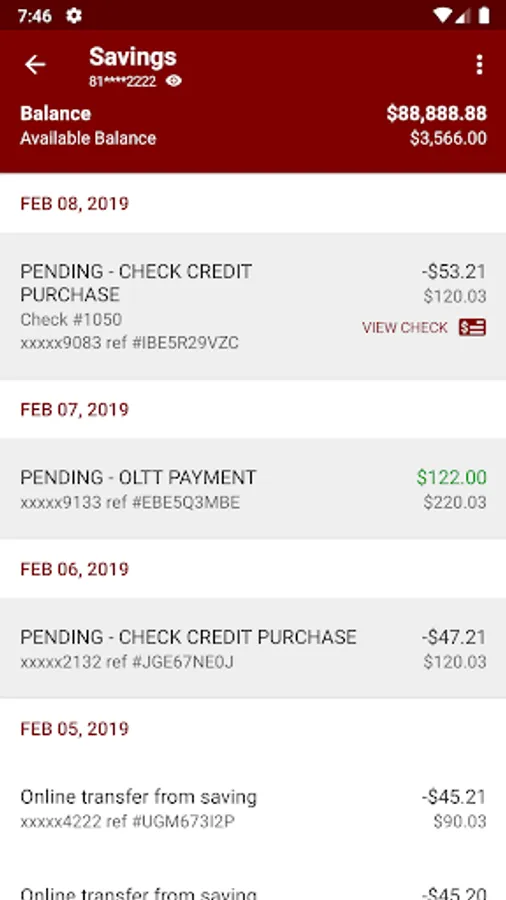 • Check your latest account balance and search recent transactions by date, amount, or check number.