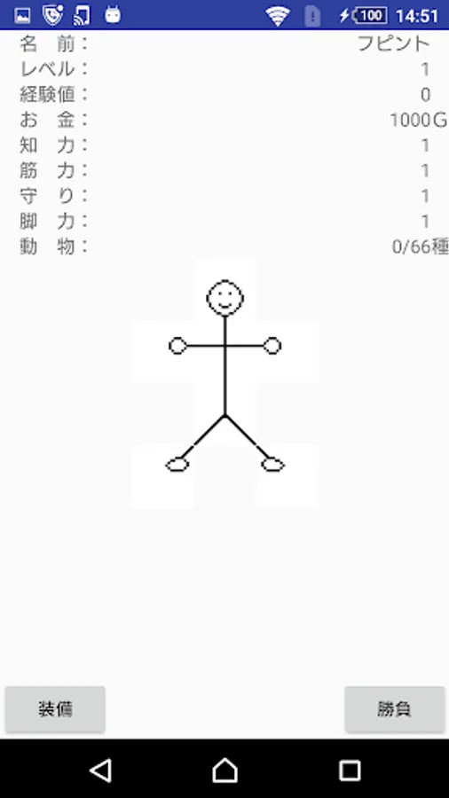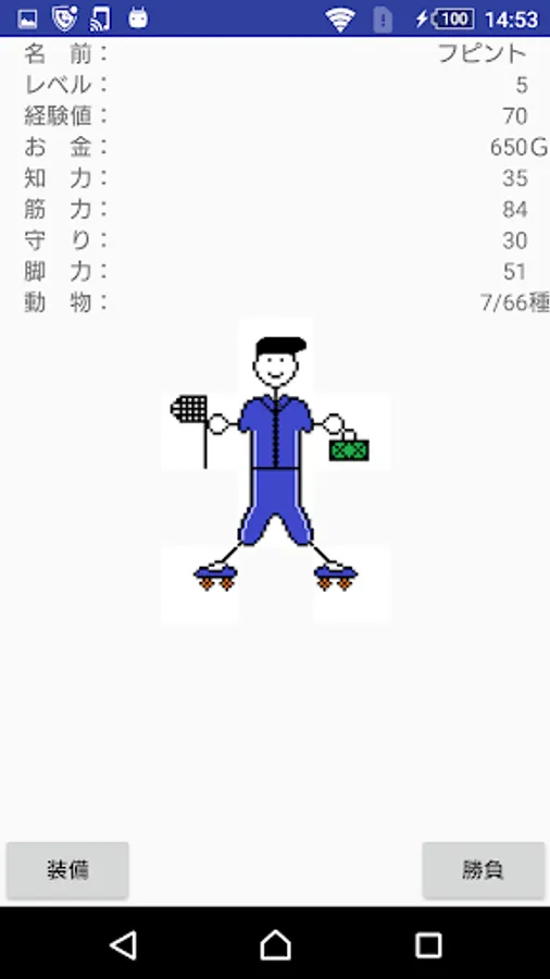 It consists of 5 screens: title, name input, information, game, and equipment.