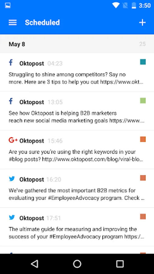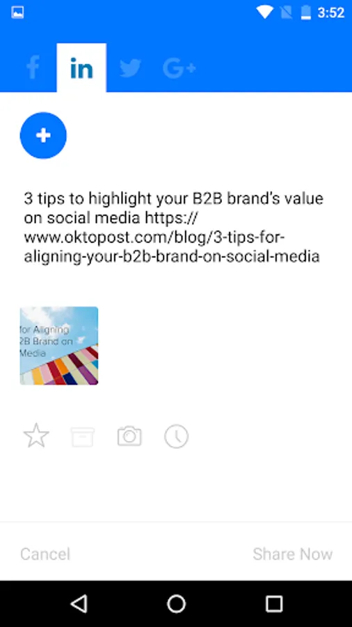 Easily share to your Twitter, LinkedIn, Facebook and Google+ accounts on the go with from your Oktopost account.