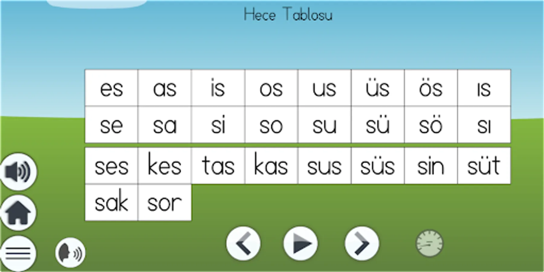 In this activity, syllables are formed from sounds and words from syllables. sounds and syllables can be heard aloud. The sound can be turned off if desired. It can be listened automatically or by touching syllables or words manually. In addition, the automatic switching speed can be increased or decreased when desired. It can also be listened to without syllables or words. All options are available within the event.