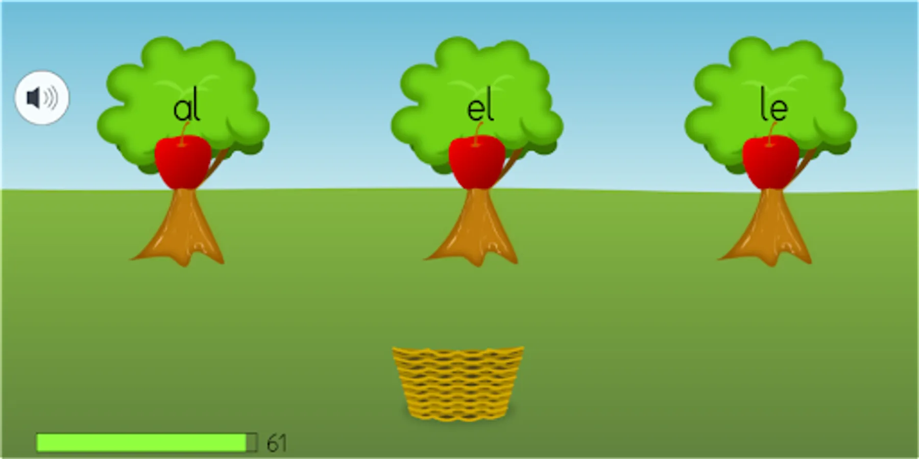 This game is intended for speed reading. The student reads the syllable or word that has been said and drags the basket under that word. The game continues in this way.