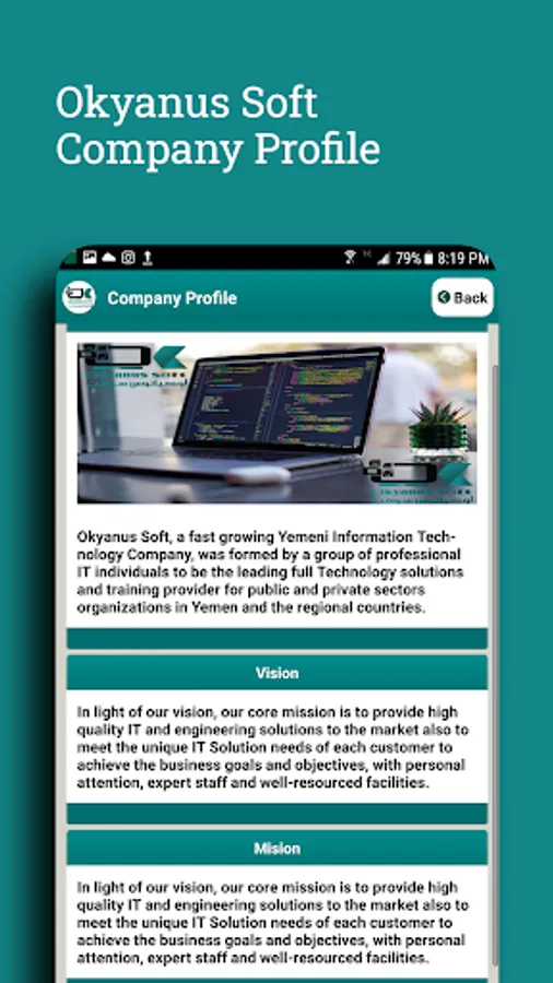 Premium Company Profile is a native application using android application for promote your company profile, product, service, contact and more. In this app you can add your about, vision and mision your company.