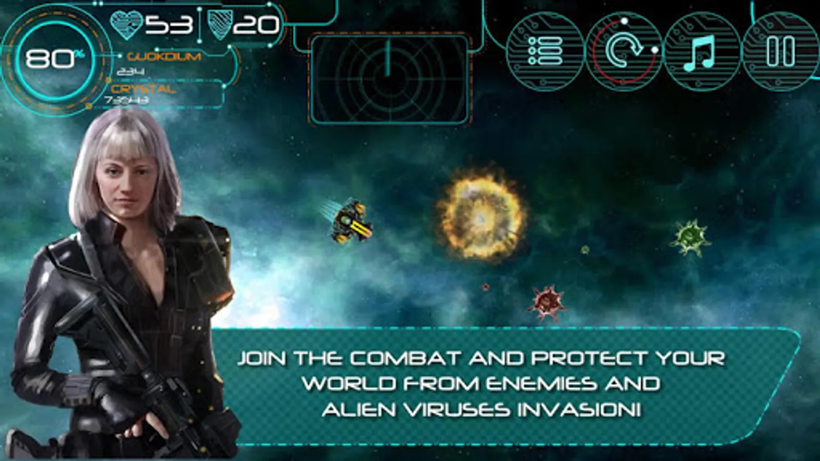 Join the combat ranks of the Earth Defense Unit and protect your world from enemies and alien viruses invasion! Discover your skills, choose your strategy, create pathway for success, Get best Space ship, use last technology upgraded elements to win battles across the Galaxy.