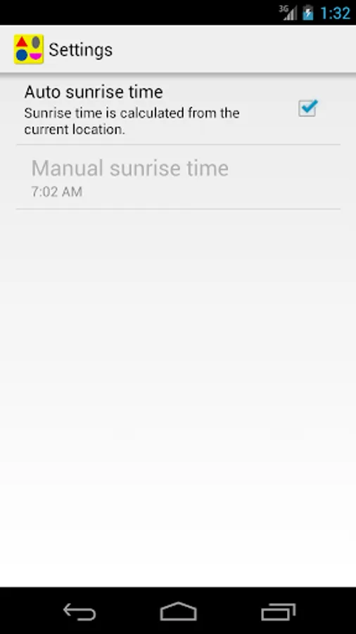 - The sunrise is calculated for the current location automatically with high accuracy.