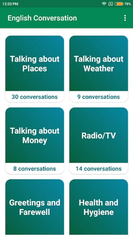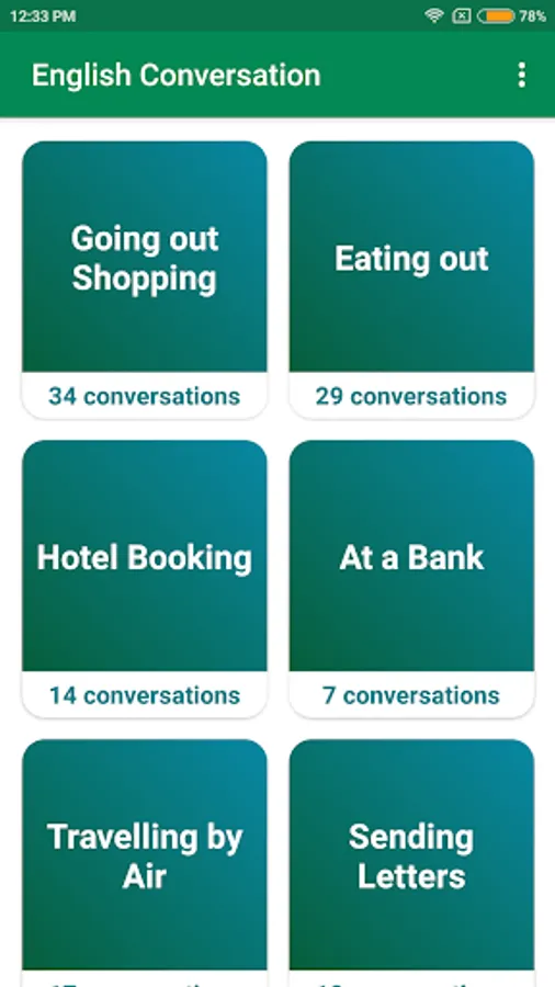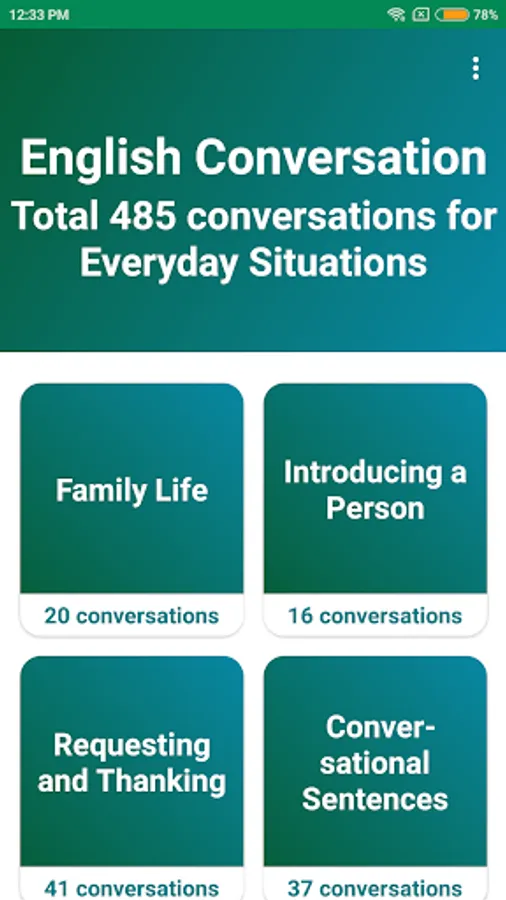English conversation everyday is an application that will help users to communicate in english properly. We have tried to organize the practice part of this app in a way so that users will not have to memorize different rules of engish grammar.