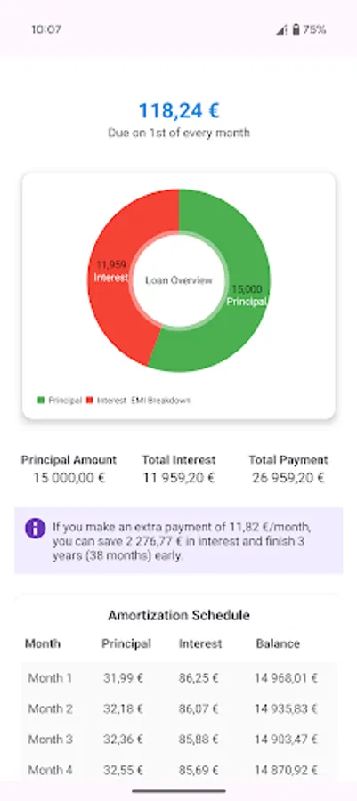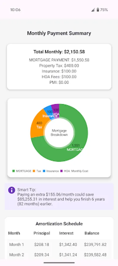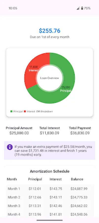 Smart Financial Tips: Get actionable insights, such as how extra payments can show potential savings in interest and reduce your loan duration.