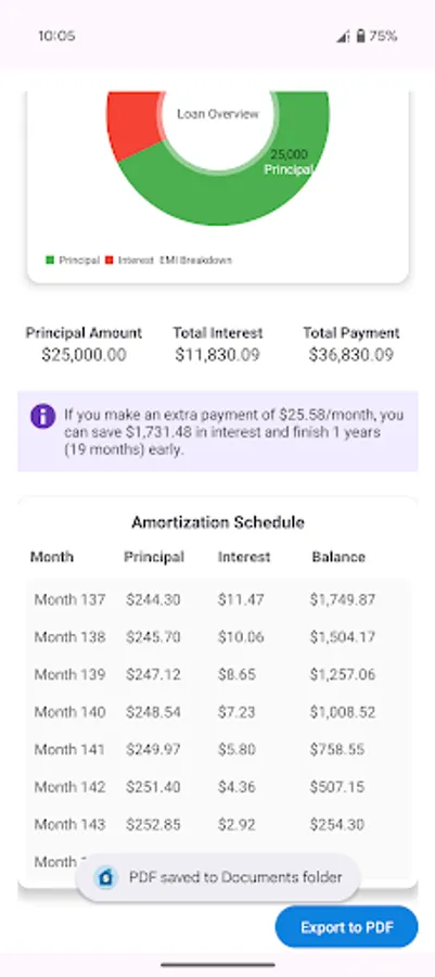 PDF Export: Easily save your detailed loan summaries and amortization schedules as professional PDF documents directly to your device.