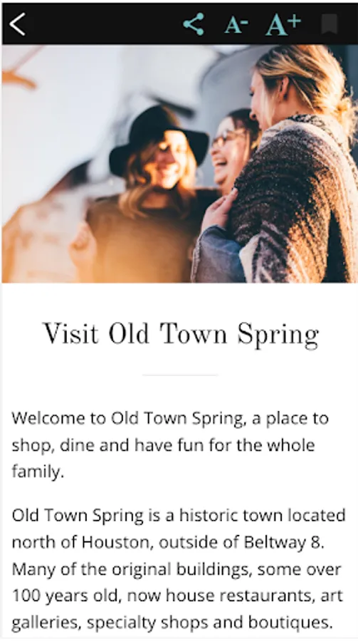 The Old Town Spring app will help you discover everything that Old Town Spring has to offer! Find your way around Old Town Spring with this FREE app! Plan the perfect day based on your interests and timeframe. Whether you're planning an upcoming visit or you're already in town, download Old Town Spring for the following features: