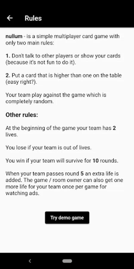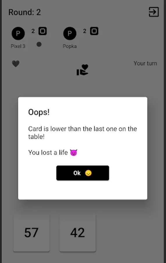 Your team play against the engine which is completely random. At the beginning of the game your team has 2 lives and each player start with a card amount equal to the current round (1 card, 2 cards etc.). You can go or skip the turn and pass it to the next player but FOLLOW two main rules: don't talk or share your cards and put a card that is higher than the last one on the table (at each round start it is 0).