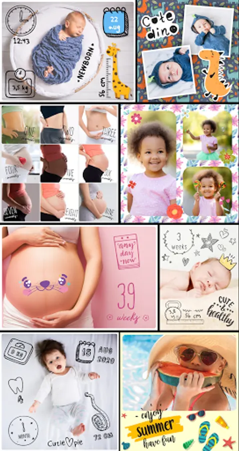 Featuring a vast collection of awesome templates, Cute makes it effortless to create stunning photo compositions. Choose from a variety of pre-designed layouts that beautifully showcase your baby's growth, from the early stages of pregnancy to their first year and beyond. The templates are thoughtfully crafted to highlight each milestone, allowing you to create memorable visuals to cherish for a lifetime.
