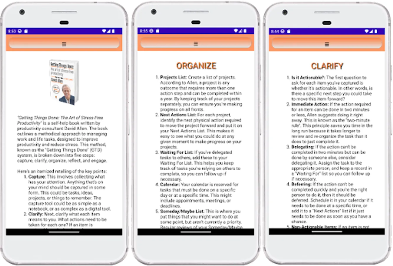 We've meticulously condensed Allen's transformative techniques into an easy-to-use, interactive guide designed to streamline your workflow, declutter your mind, and elevate your efficiency. Whether you're drowning in a sea of tasks or struggling to maintain focus, our app is the lifeline you need.