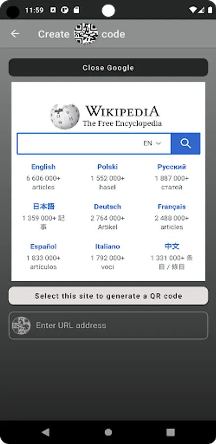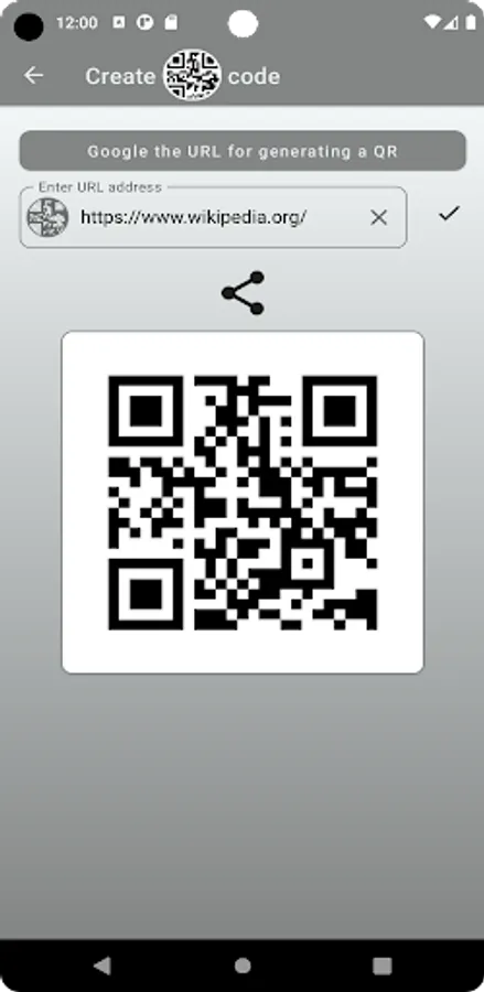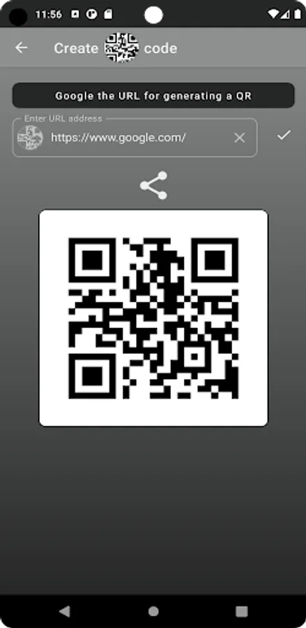 This simple App where you can write down or Google the URL and by click "Create QR" you get this QR code and after then you can share this QR by choosing another app's you have into your phone