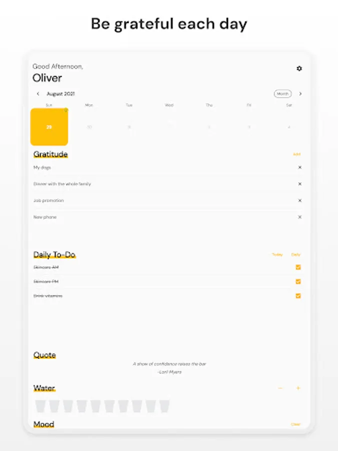Gratsy is your everyday self-care app. It has quote of the day, mood tracker, water intake tracker, daily to-dos and a gratitude journal all in one cute package.