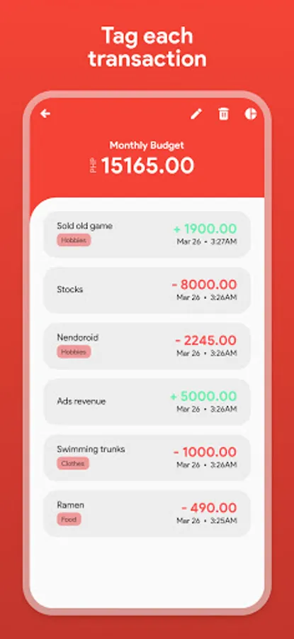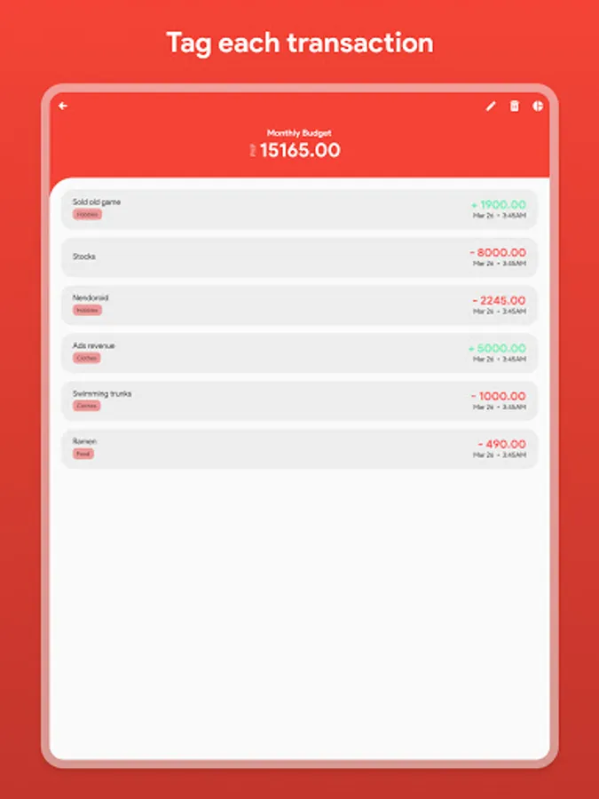 Create multiple wallets for different purposes, - even supporting different currencies. Create tags to properly categorize each transaction while also being able to provide those transactions with a short description; you can even easily duplicate each transaction.