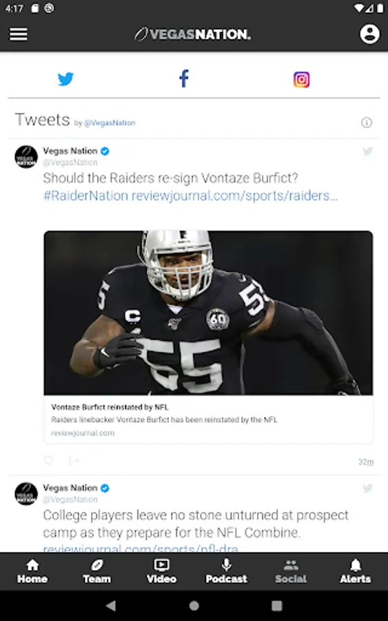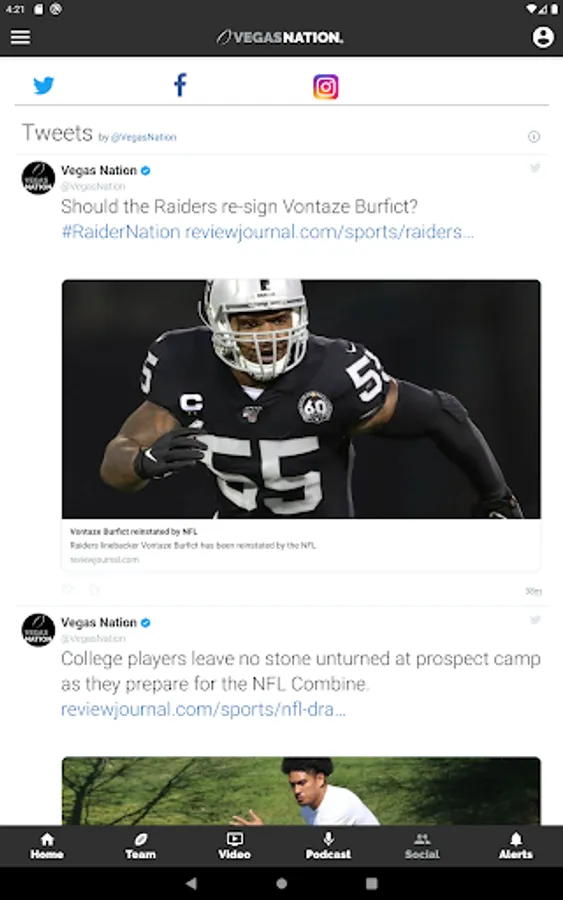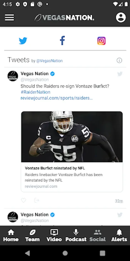 Social: Connected to the VEGAS NATION Twitter, Facebook and Instagram accounts for up-to-the minute news.