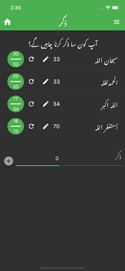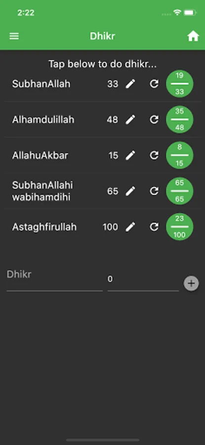 There is a unique dhikr (tasbih or tasbeeh) functionality through which the users can do their daily dhikr. They can also add their own dhikr words as much as they want.