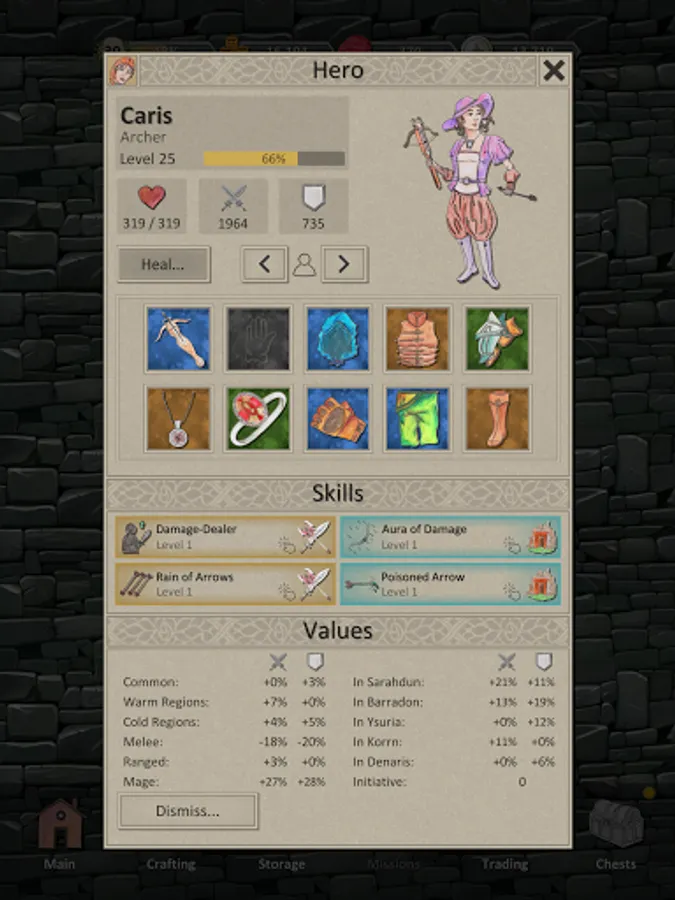 - Recruit heroes, choose and improve their skills and equip them with powerful items