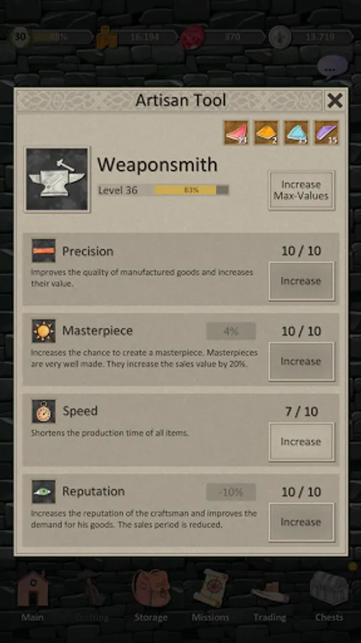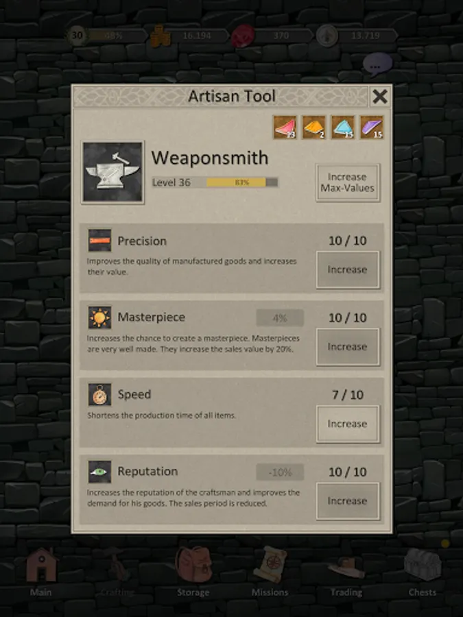 - Train your artisans, improve their skills and reputation and create valuable items