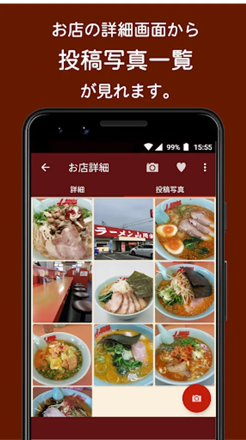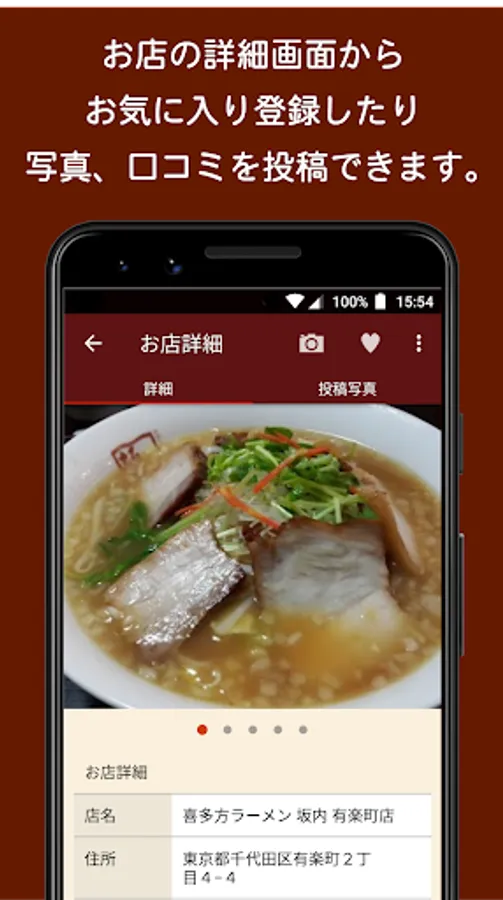 一覧表示から各ラーメン店名をクリックしてお店の詳細ページから、口コミ、ラーメン店の写真、ホームページURL、住所、電話番号、などが表示されます。