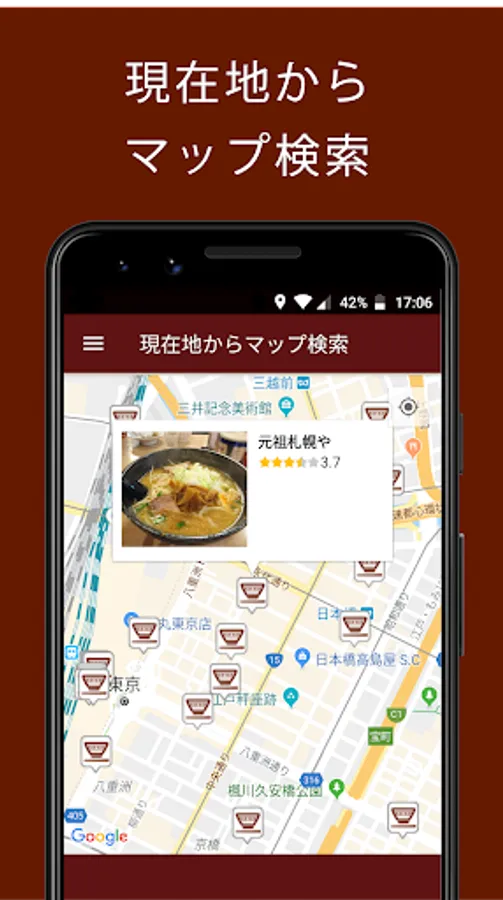 GPSから取得した現在地から、近くのラーメン店をマップ検索。さらにドラックして周辺のラーメン店も表示、一覧表示タブから現在マップ表示されているラーメン店を現在地から近い順に一覧表示されます。