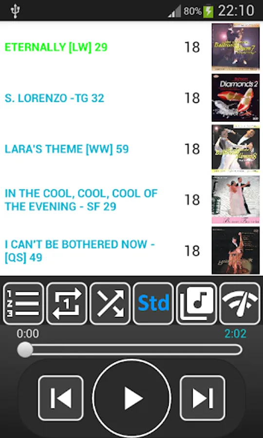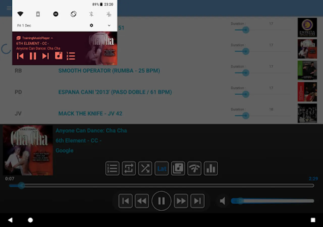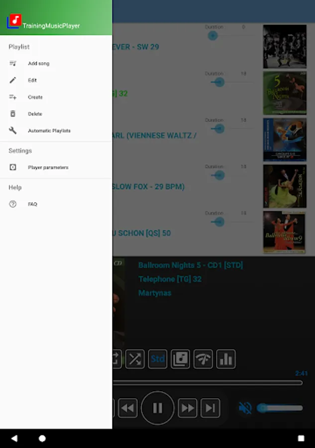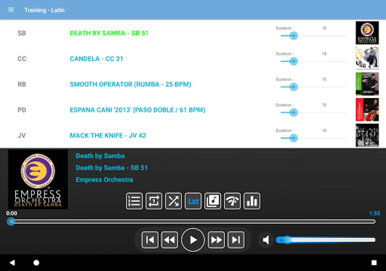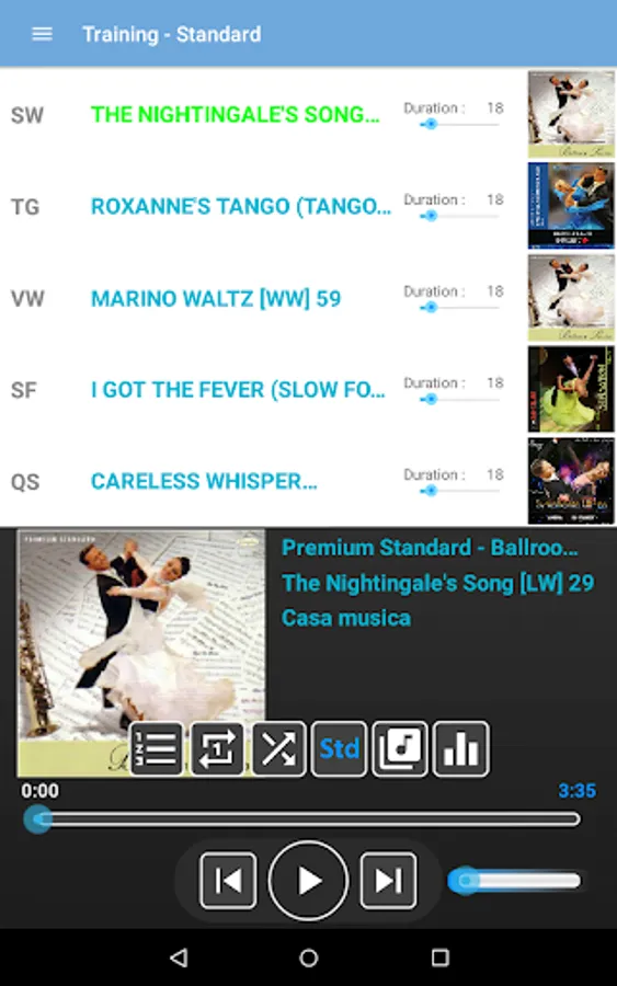 A music player suitable for dancesport training, to work on each dance or to make finals.