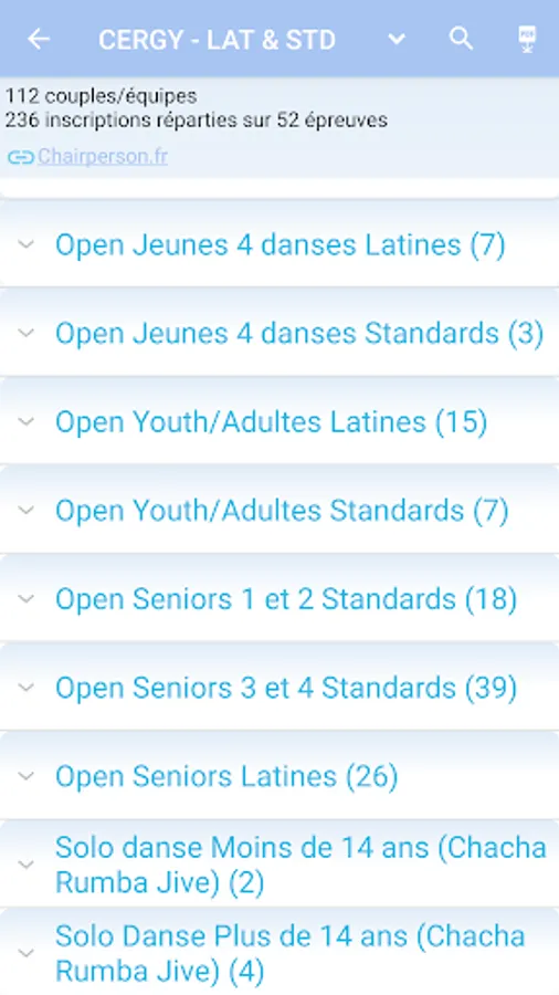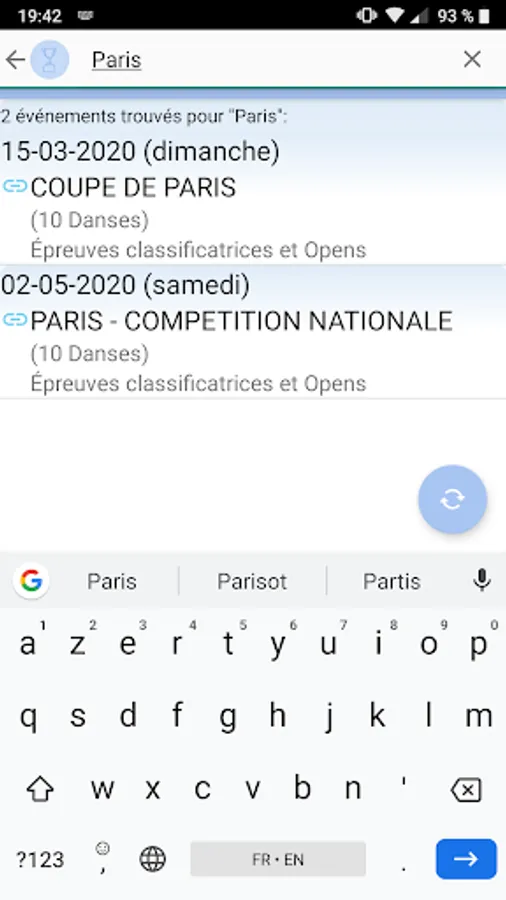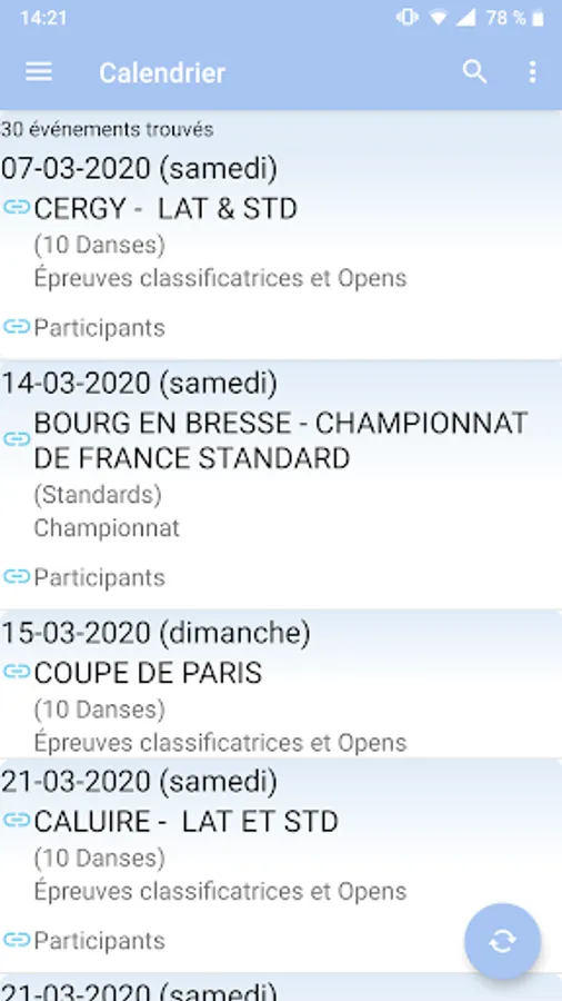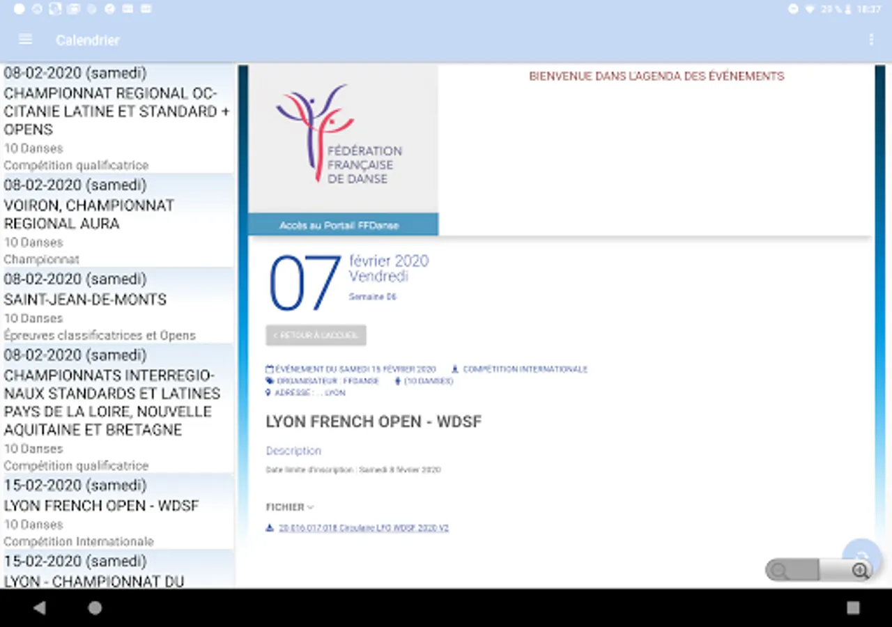 The application lists the events and provides access to the corresponding pages on the site of the French Dance Federation.