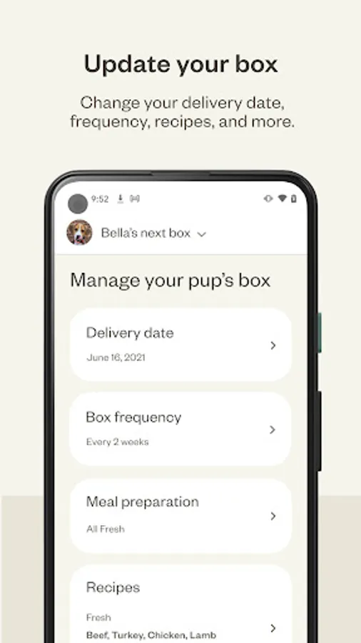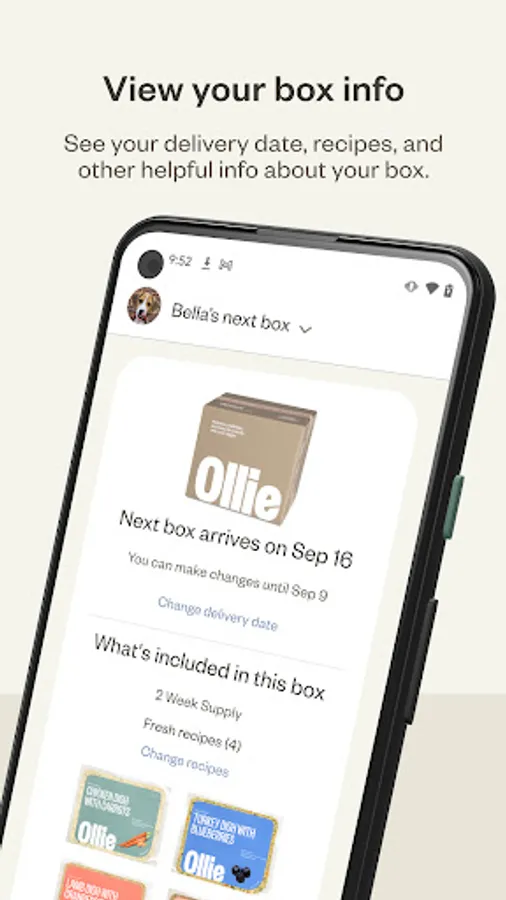 Easy access to your subscription so you can pick new recipes, change your delivery date, update your frequency, and handle everything else to do with your dog’s Ollie subscription.