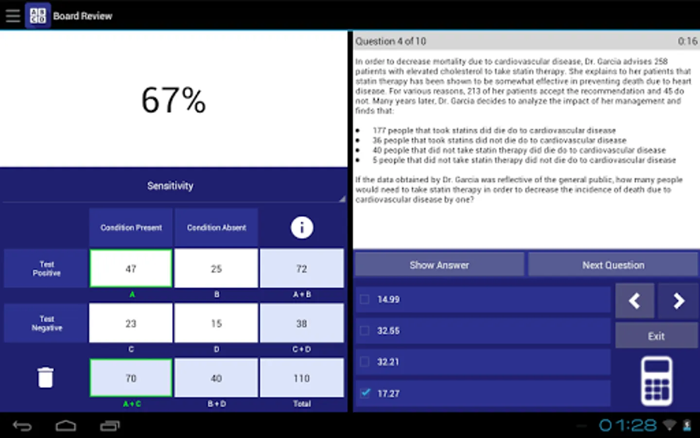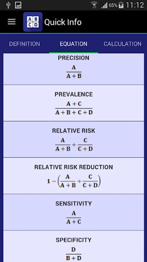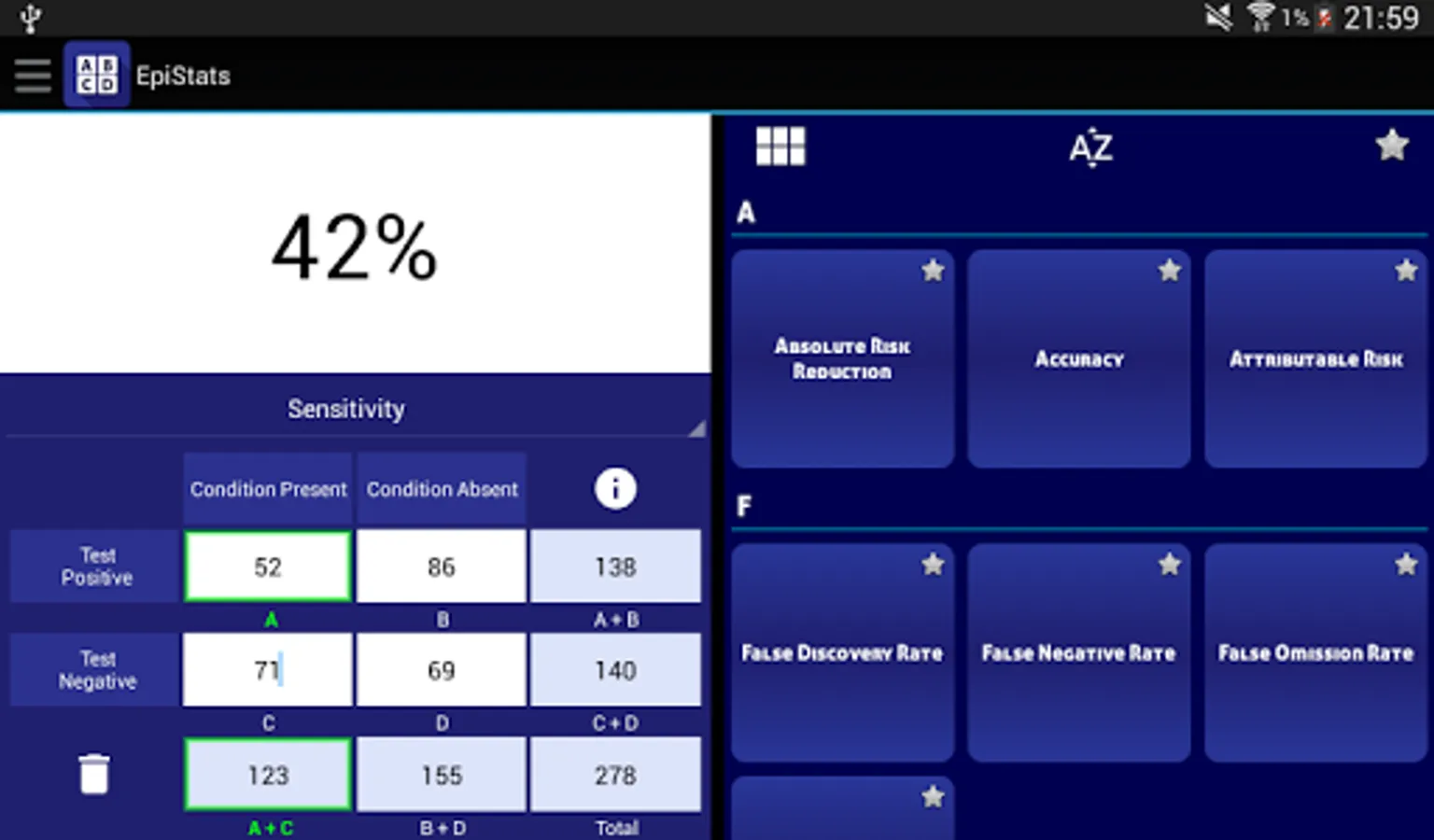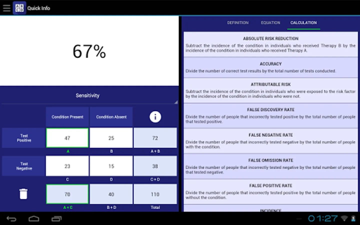 Our simple and easy to use 2x2 sample table is great for making quick calculations in biostatistics. Simply enter data into the highlighted boxes and the solution will appear. All of the most important equations are here – from absolute risk reduction to odds ratio to specificity. But as your knowledge and understanding of medical biostatistics grows, we suggest that you become accustomed to solving questions without the use of our 2x2 sample table.