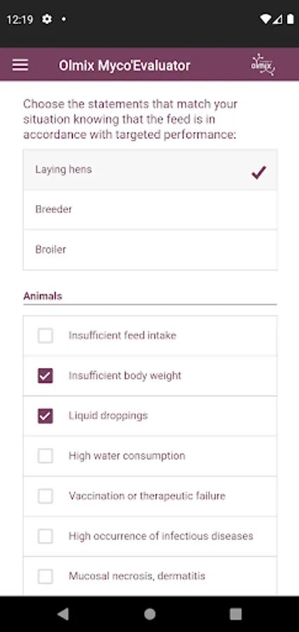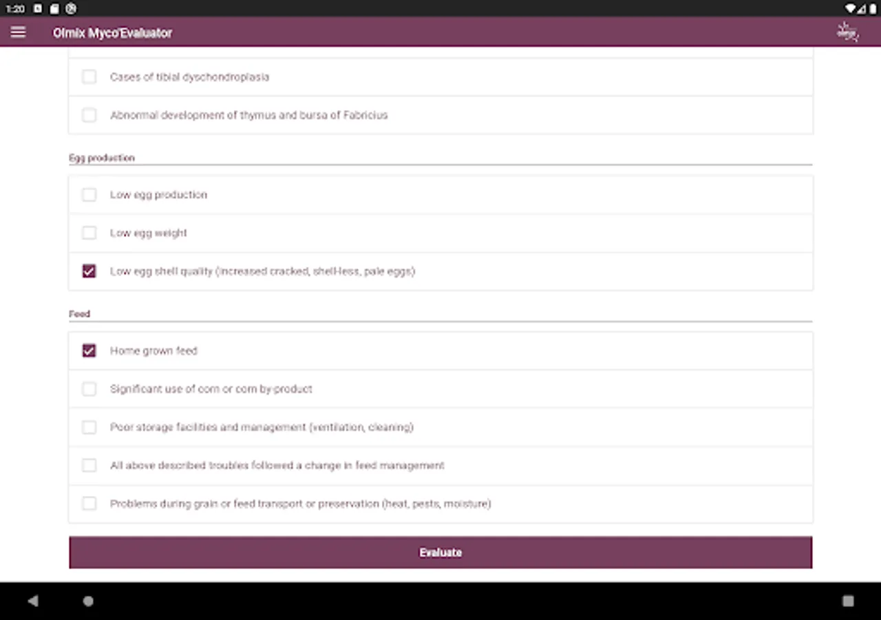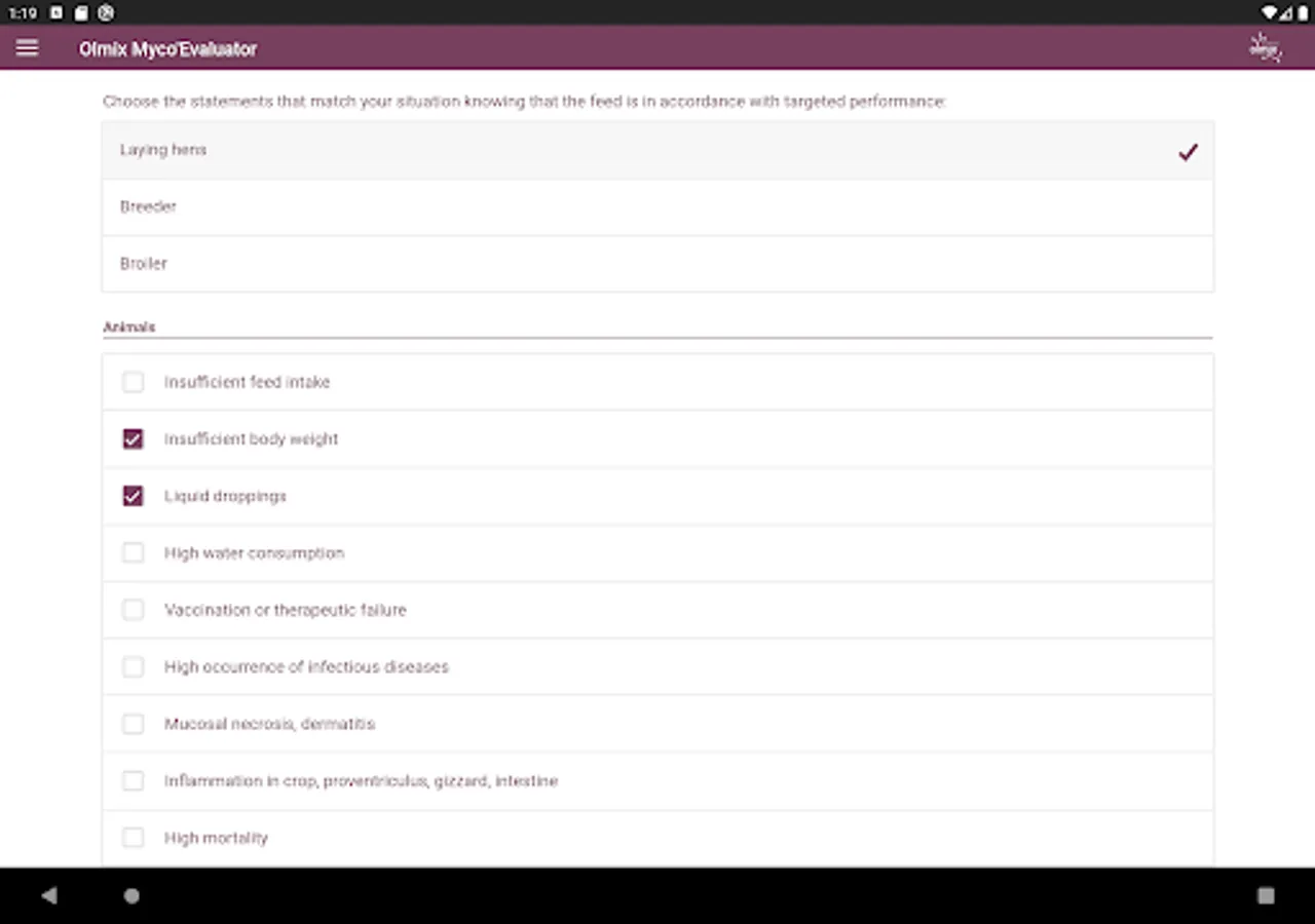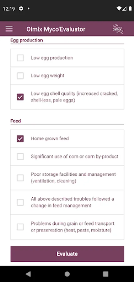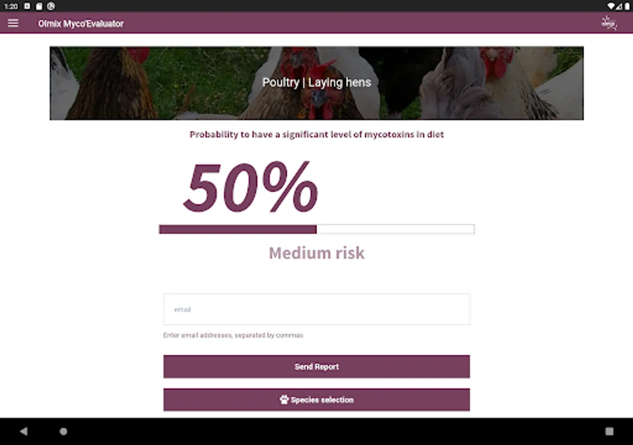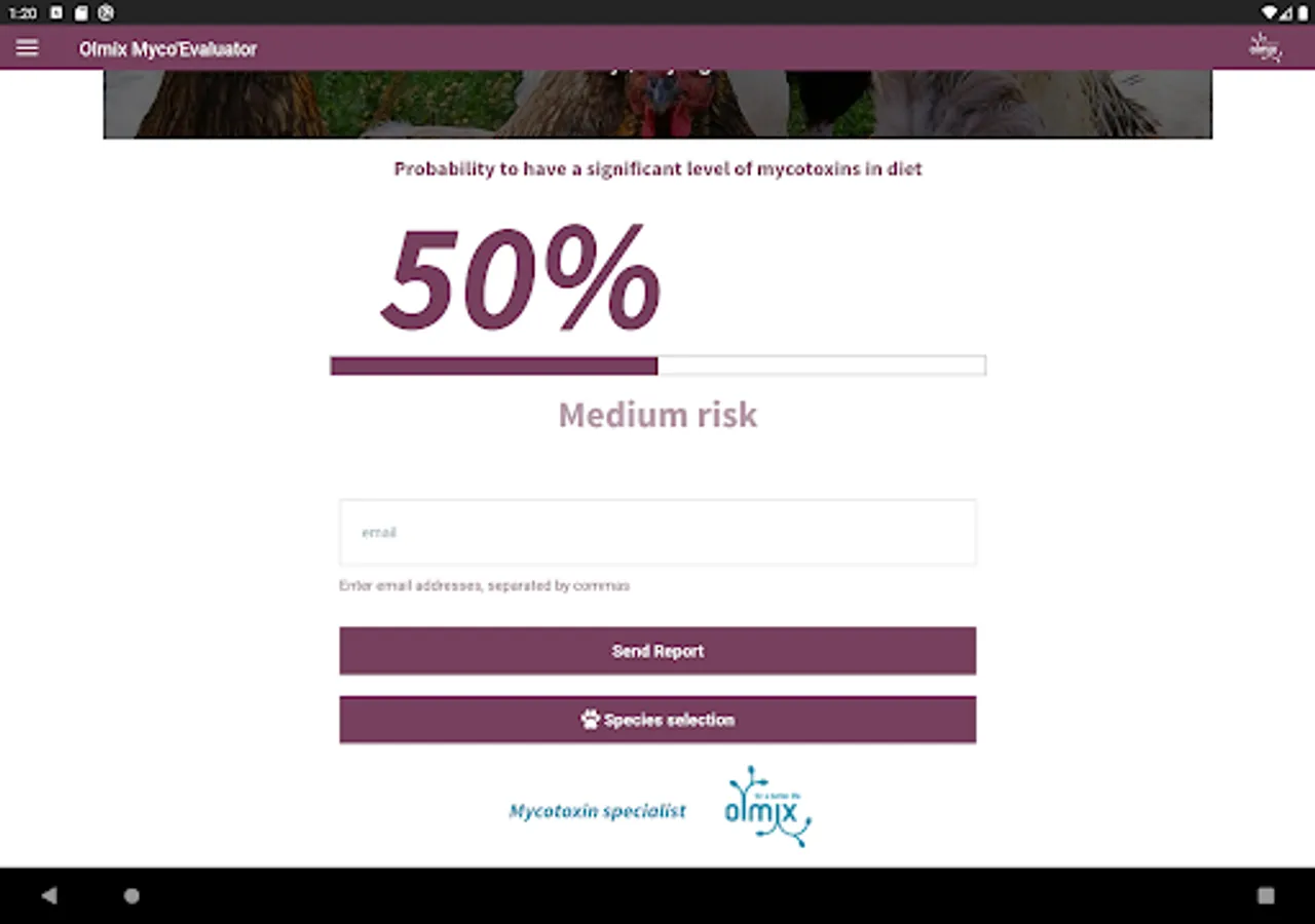 Olmix Myco’Evaluator helps to identify risk factors of mycotoxin contamination thanks to the audit of crop and feed management, storage conditions and animal symptoms. From these risk factors, Olmix Myco’Evaluator calculates the probability of high mycotoxin contamination in feed. This is the first step of the mycotoxin diagnosis developed by Olmix.