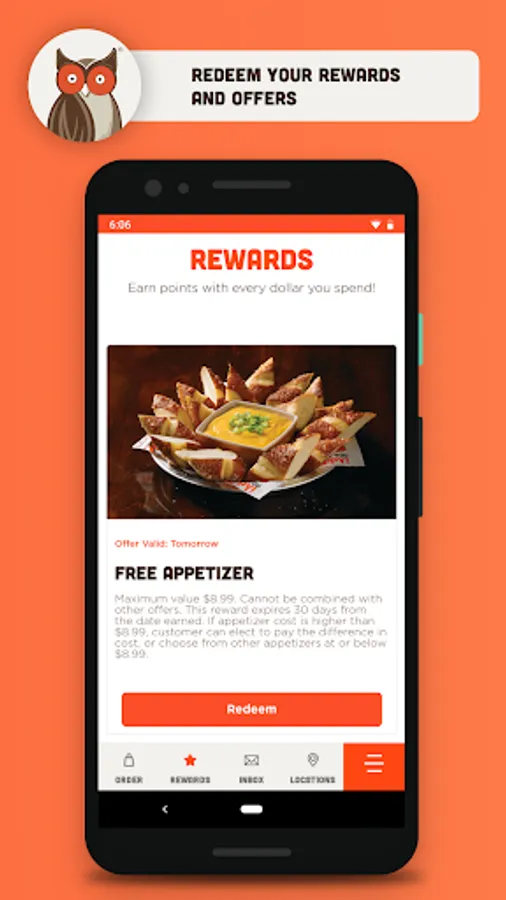 Your first reward is waiting for you in the app now, and it’s a classic. Get a free appetizer on us when you register today and then earn more free food after every 8th qualifying dine-in visit or online order of $12 or more. You’ll also be treated to other discounts and special offers, like 10 free wings on your birthday every year!