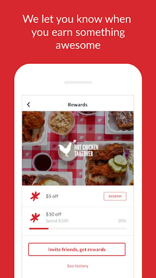 Download the Hot Chicken Takekover app to get rewards and to redeem them with every order. Here’s how it works: