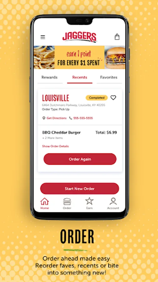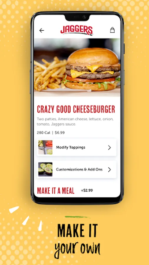 Find your closest Jaggers and order ahead for all your favorites like our Crazy Good Cheeseburger and customize your toppings. Add a Strawberry Shake or Shoestring Fries too! Choose drive-thru, carry-out or curbside pickup — whatever is most convenient for you. When you arrive, “Check In” so your order is made hot and fresh. For curbside pickup, enter your parking spot number and car details, and we’ll bring your order right to you. Join our Rewards program and earn points with every order. Collect points and redeem them for free Jaggers rewards.