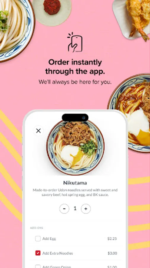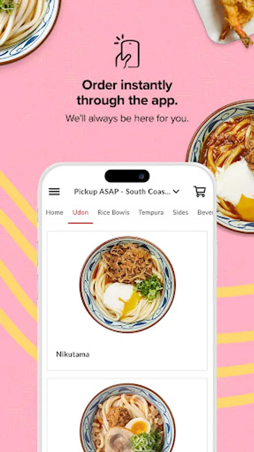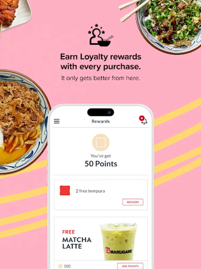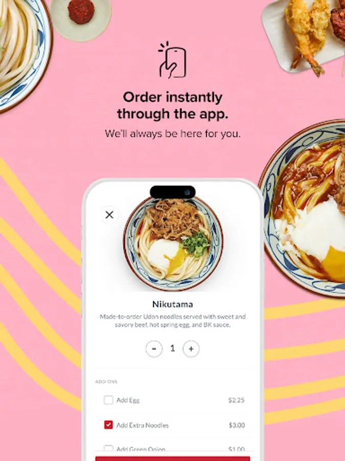 Download our official Marugame Udon app to join our rewards program. Earn points when you order online for pickup or delivery.