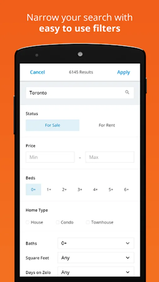 Input your preferences and filter by property type, price range, beds, baths, or size.