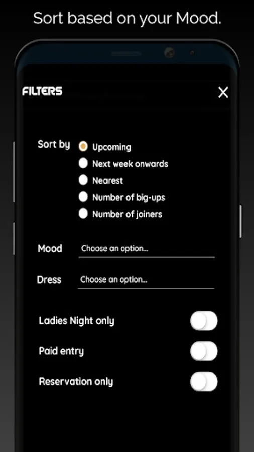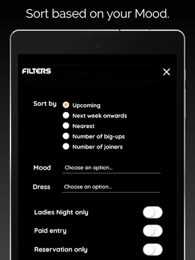 Filter & Sort by: Ladies night only, Mood, Dress code and others.