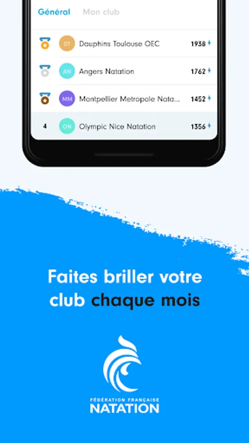 • Join the members of your club if you are FFN licensee, compare your performance and discover the ranking of all clubs in France.