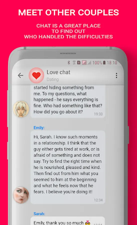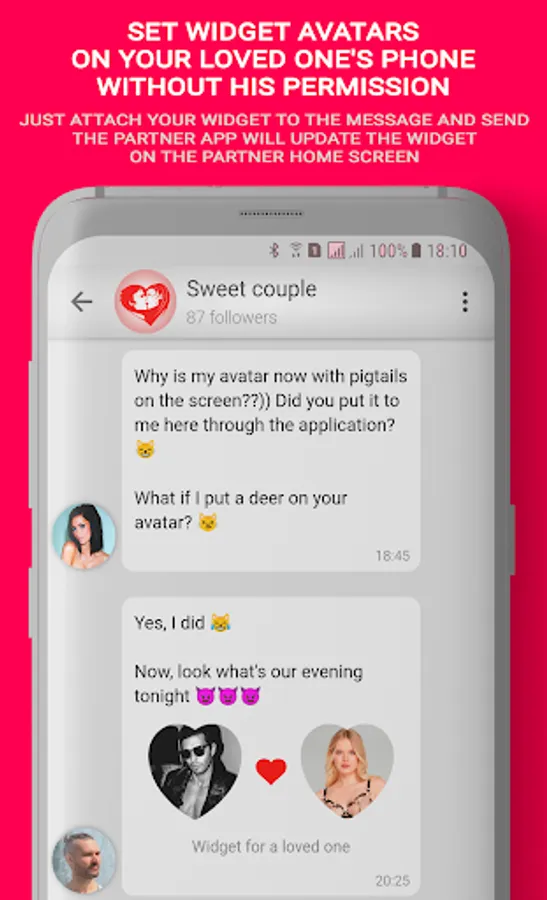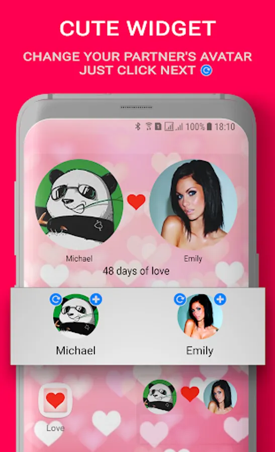 In addition to the main part of the application there is also a love widget that can be customized for every taste - choose a text color, show how many days together or not display. But most importantly you can change the avatar of your loved one every day by simply clicking on the icon or select a photo of your loved one on the widget. This will set the mood and give strength to build communication in your couple and create close relationships.