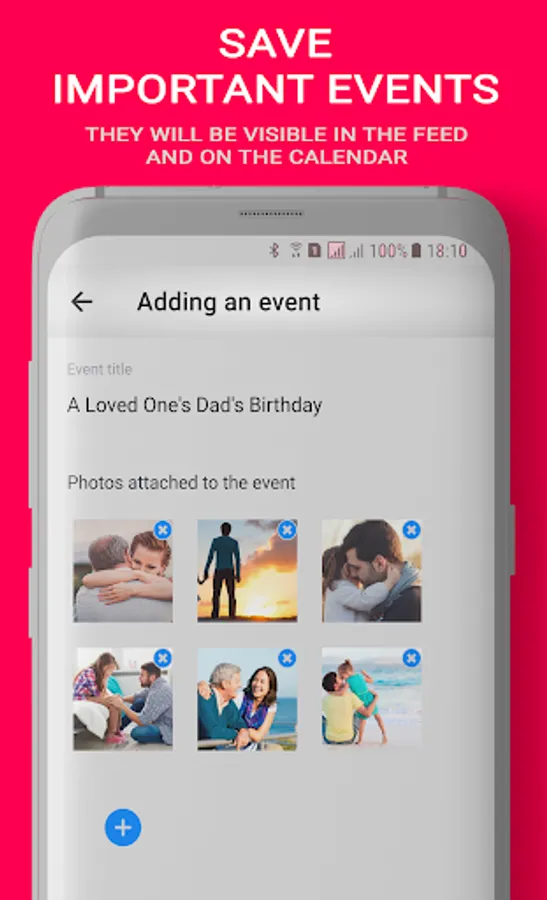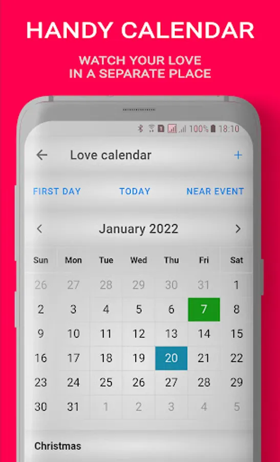 The love calendar is a special place on the phone where you can store only what is related to your love (anniversary). Everyone knows that it is very important to have a separate place for an important part of life. Love alarm - for each event notifications are automatically set - a week before, twice the day before (at noon and in the evening at 9 o'clock), and on the day of an important event.