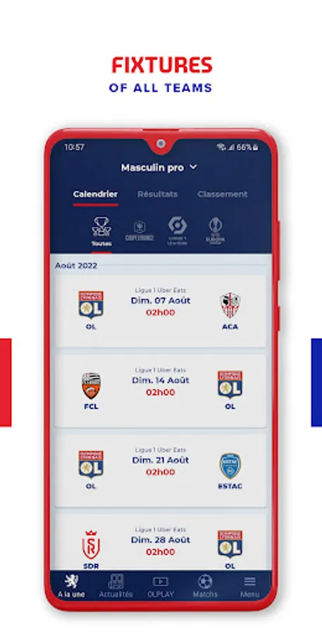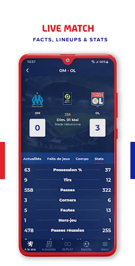 OLPLAY is the live l’OL app that lets you enjoy the Live Match experience to the full, offering you match commentary and in-depth stats in real time. With the OL app, you can also find out about all the Olympique Lyonnais teams: men’s and women’s football, the academy teams, eSports, and the LDLC ASVEL men’s and women’s basketball teams.
