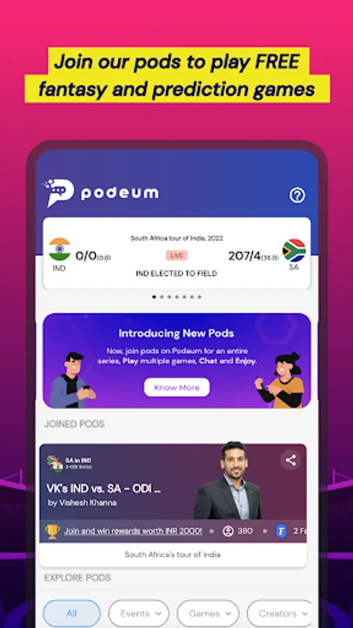 On Podeum - you can explore, join, host and engage in ‘Pods’. Pods are free-to-join fan groups that can be hosted by sports experts, players or fans. Here - you can enjoy live-match games, fan chats, trivia, analysis, memes & more.