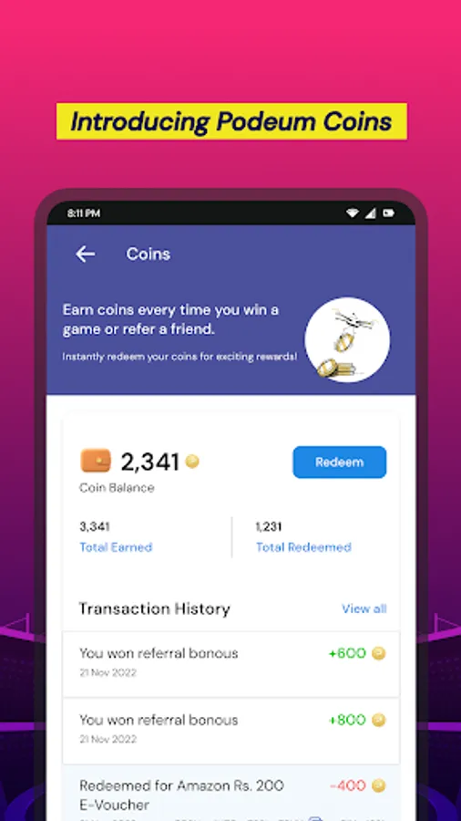 Podeum Coins are Podeum’s in-app currency. You can earn them by referring friends to the app, finishing at the top of the leaderboard in Pod games, or becoming a Podeum Guru. Once you get a minimum balance of Podeum Coins, you can redeem them instantly for various kinds of gift vouchers. Pod rewards are sponsored by the host and Podeum. We currently do not offer pay-to-play games.